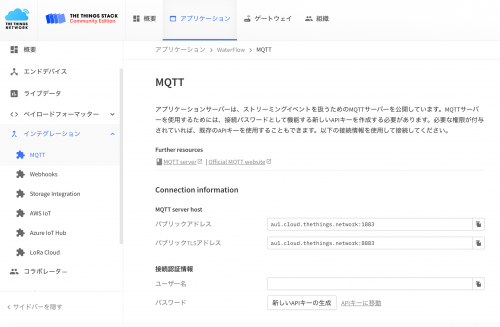 MQTTサーバのアドレスや接続認証情報、APIキーの生成などはコンソールのアプリケーションでインテグレーションからMQTTを選択すると確認できます。